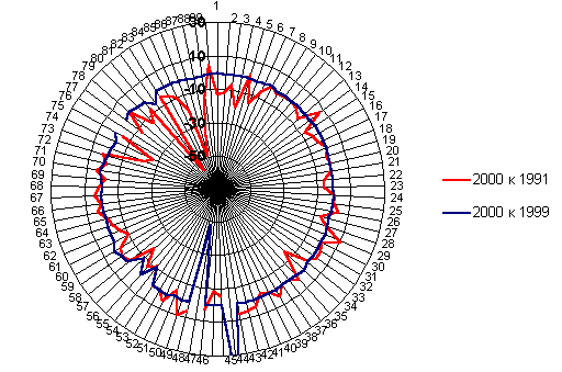 Рис. 6. Компоненты прироста (убыли) сельского населения России на 1000 человек, 1991-1999 Больше всего за 1989-1999 гг. доля городских жителей сократилась на Северном Кавказе, который и так является наименее урбанизированным районом России (с 57,3 до 55,3%), а также в Западной Сибири (с 72,8 до 71,1%). В целом сокращение было более интенсивным на азиатской части России. Рост доли горожан за эти годы не прерывался в Центрально-Черноземном (с 60,3 до 62,6%) и Волго-Вятском (с 68,9 до 70,6%) районах. После некоторого снижения в 1992-1993 гг. она вновь стала увеличиваться в Центральном, Северном, Восточно-Сибирском и Дальневосточном районах и стабилизировалась в Северо-Западном и Поволжском районах. Общим итогом региональной динамики городского и сельского населения стало нарастание разрыва между городским Европейским Центром и сельским Юго-Востоком. Если в 1959 г. совокупная доля Центрального, Северо-Западного, Волго-Вятского и Центрально-Черноземного экономических районов в городском населении России составляла 40,7%, а в сельском - 41,0, то к 2000 г. - соответственно 39,4 и 28,7%. При этом доля Северного Кавказа в сельском населении России повысилась с 11,9 до 20,2%. Таблица 5. Распределение городского населения федеральных округов Российской Федерации по типам поселений на начало 2000 г., %