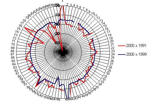с числом жителей 250 тыс. и более, - примерно 44%. В целом за период после переписи 1989 г. сельское население увеличилось на 428 тыс. человек, или на 1,1 %, а городское население уменьшилось на 1904 тыс. человек, или на 1,8%. В результате впервые стала снижаться доля горожан. Всего лишь за 4 года - 1991-1994 - она сократилась с 73,9 до 73,0%, затем начала медленно расти, но за 1999 г. вновь сократилась - с 73,2 до 72,9%. В отличие от предыдущих десятилетий доля крупнейших городов снизилась и увеличилась доля городов, насчитывающих от 10 до 500 тыс. жителей. Не последнюю роль в этом сыграло открытие в середине 1990-х гг. данных о численности населения ряда закрытых административно-территориальных образований 2, среди которых 20 городов с общим числом жителей 999 тыс. (от 12,9 тыс. чел. в г. Островном Мурманской области до 119,3 тыс. чел. в г. Северске Томской области). Всего в таких поселениях проживает 1163 тыс. человек. За 1999 г. их совокупное население выросло на 0,9 тыс., а за 1995-1999 гг. - на 60,4 тыс. человек.