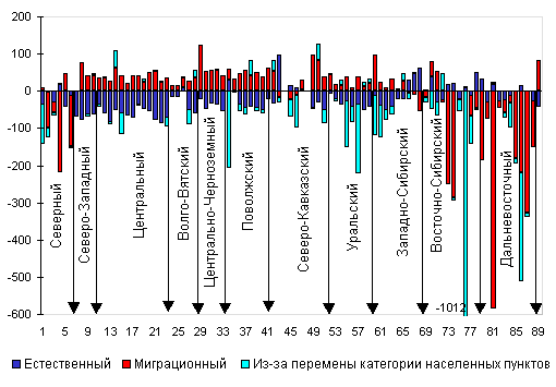 Рис. 5. Компоненты прироста (убыли) городского населения России на 1000 человек, 1991-1999 Механический прирост сыграл решающую роль и в динамике числа сельских жителей, хотя для сельского населения характерен больший размах вариации естественного прироста по регионам и более интенсивный рост за счет административно-территориальных преобразований (рис. 6). В результате во многих регионах России стала уменьшаться доля городского населения. В периоды между переписями удельный вес горожан редко сокращался - лишь в 2-3 регионах. За годы, прошедшие после переписи 1989 г., он сократился в 42 регионах. И хотя, начиная с 1995 г., рост доли городского населения в России возобновился, даже в 1998 г. насчитывалось 20 субъектов Федерации, в которых она убывала, а в 1999 г. - 32.