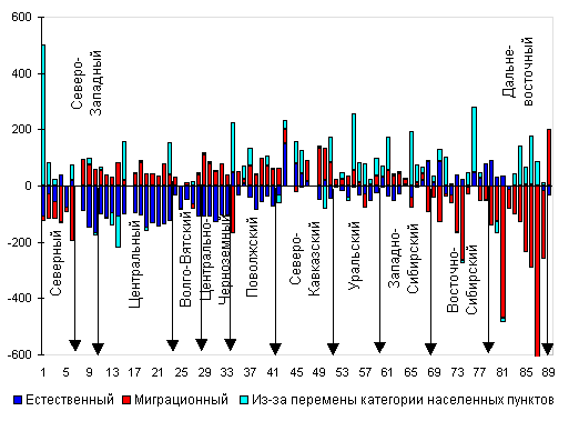 Рис. 4. Прирост численности сельского населения регионов России, 1991-2000, % Хотя доминирующей тенденцией динамики населения 1990-х гг. была естественная убыль, заметную роль во многих регионах сыграло превращение части горожан в сельских жителей за счет преобразования городских поселений в сельские, а также миграция (рис. 5). В ряде случаев решающими были административно-территориальные преобразования (наиболее яркие примеры - Усть-Ордынский Бурятский и Коми-Пермяцкий автономные округа, республики Карелия и Калмыкия, Оренбургская область), в других - процессы межрегиональной и межстрановой миграции (Чукотский, Таймырский и Ненецкий автономные округа, Якутия). Реже интенсивная убыль городского населения была обусловлена и тем, и другим фактором вместе (в республиках Кабардино-Балкарии, Карачаево-Черкесии, Бурятии, Коряксюм, Эвенкийском и Ямало-Ненецком автономных округах, Тюменской, Камчатской и Магаданской областях). В некоторых регионах Севера и Дальнего Востока снижение численности горожан было обусловлено всеми тремя компонентами, включая естественную убыль населения (в Мурманской, Архангельской, Сахалинской, Амурской, Читинской и Иркутской областях, Хабаровском и Приморском краях, Республике Коми). Городское население Европейского Центра росло за счет миграционного притока, который, однако, в большинстве случаев не перекрывал естественную убыль.