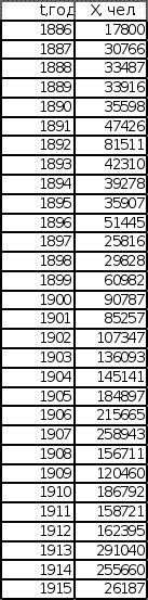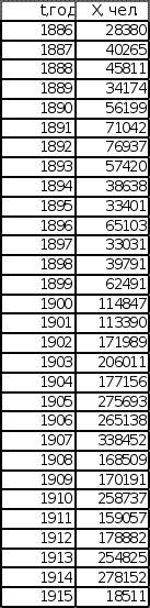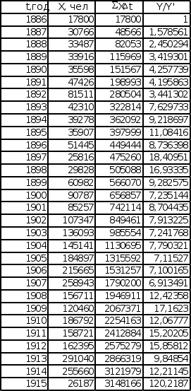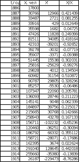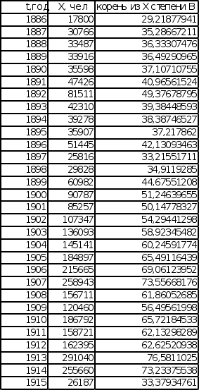 1. Введение Анализ эмпирических данных используется в качестве анализа многих экономических показателей для возможности прогнозирования изменения этих показателей. Прогнозированием различной экономической динамики занимаются технический и фундаментальный анализы. Технический анализ по результатам исследования предоставляет конкретное решение по действиям, а на базе фундаментального анализа, можно построить прогноз динамики изменения конкретного показателя в будущем. В качестве исследуемой последовательности будет взят эмпирический набор экономических данных, имеющий растущую тенденцию изменения во времени. Данные исследования эмпирических данных будут проводиться с целью выявления некоторых функциональных зависимостей между ними, а также математической модели, к которой наиболее близко приближается эмпирическая зависимость. В данной курсовой работе будет проведен анализ двух эмпирических последовательностей на соответствие математическим моделям роста, таким как экспоненциальная зависимость и степенная зависимость. 2. Исходные данные В качестве исходных последовательностей взяты статистические данные из книги «Историческая статистика Соединенных Штатов Америки» – Эмиграция в США из Центральной Европы с 1886 по 1915 год и Эмиграция в США из СССР и стран Балтии с 1886 по 1915 год. График исходных данных представлен на листе 1 (см. Приложение). Эмиграция в США Эмиграция в США из Центральной Европы из СССР и стран Балтии (Венгрия, Австрия) (Литва, Эстония, Латвия, Финляндия)