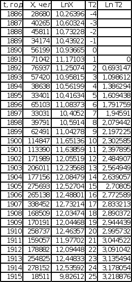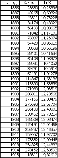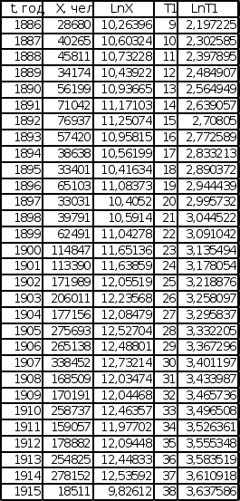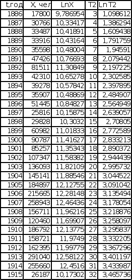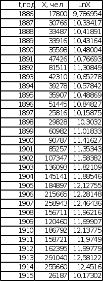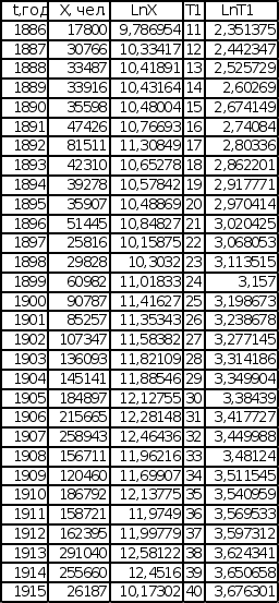 П LnX = lnX0 + Bln(t – t0) . Графики зависимости lnX от lnТ построены с учетом обоих значений t0. Для значений t0 (t – t0 = T1, t0= 1877 для последовательности Эмиграция в США из Центральной Европы, t0 = 1875,5 для последовательности Эмиграция в США из СССР и стран Балтии), полученных при исследовании графиков обратного темпа роста интеграла эмпирической последовательности, графики имеют вид, представленный на листе 7 (см. Приложение). Эмиграция в США Эмиграция в США из Центральной Европы из СССР и стран Балтии