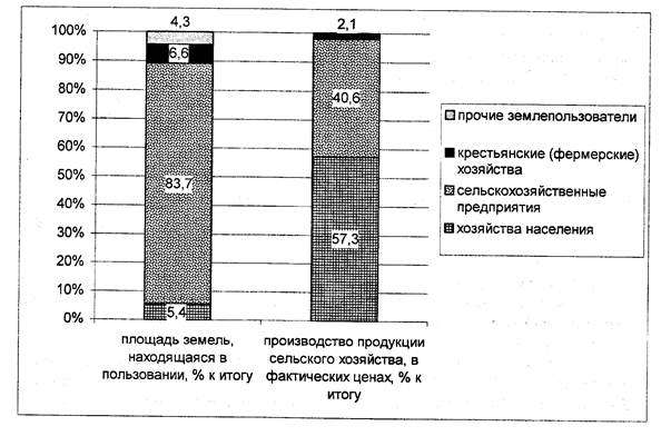 По различным причинам, и коллективные сельхозпредприятия в форме акционерных обществ, и личные подсобные хозяйства нельзя считать ни достижением, ни потенциальной движущей силой реформы. ЛПХ в том или ином виде существовали и при Сталине. Они имеют определенный предел роста, определяемый малым размером участка. В настоящее время они являются символом и формой примитивного натурального хозяйства. Коллективные сельхозпредприятия могут, видимо, существовать лишь в условиях Центрального черноземья, где, благодаря высокому почвенному плодородию и определенному менталитету населения, возможно применение жестких вертикальных схем управления при выращивании ограниченного набора культур на больших площадях. Но, как уже говорилось, и их нельзя считать устойчивыми в том виде, в котором они существуют, так как они слишком малоотзывчивы к требованиям рынка. Кроме того, схема управления такими хозяйствами должна быть вписана в строгую систему обязательных агроэкологических мероприятий, экологических ограничений и обременении. Наконец, если речь идет о фермерских хозяйствах, то они не испытывают недостатка в земельной площади для сельскохозяйственной деятельности: средний размер участка составляет 48 га. По мнению Е.и С. Пономаренко, «весь ход земельных реформ 19-20 веков в нашей стране и странах Европы показал, что сельское хозяйство более эффективно вести на достаточно крупных частных наделах. Однако, полная неопределенность статуса землевладения приводит к уничтожению ресурсов и снижению продукционного потенциала территории на следующем этапе развития (через 10-20 лет)». Дело в том, что именно земля (и только) может быть основой успешной деятельности фермера в условиях рынка. Если городской житель может начать свое дело, заложив квартиру и получив кредит, то для фермера эта возможность официально исключена - даже не по причине отсутствия законодательства об ипотеке, а просто потому, что в стране отсутствует развитый земельный рынок, связанный с рынком капитала. Высокое соотношение доли занимаемой земли и доли фермерской продукции, как это видно на рис. 2 (у фермеров - 3; у колхозов - 2; у хозяйств населения - 0,1) - результат кризисного состояния фермерских хозяйств, испытывающих острую нехватку основных средств и долгосрочных кредитов. В этих условиях фермеры не способны эффективно использовать даже те небольшие наделы, которые у них есть. Поэтому в отношении фермера следует говорить не о дефиците земли, а о невозможность использовать ее в полном экономическом смысле: как способ получить и урожай и как источник собственных средств. Несмотря на это, именно фермерские хозяйства являются единственным потенциально эффективным и устойчивым субъектом рынка сельскохозяйственного производства. Только они, при условии реализации прав собственности на землю, могут быть кровно заинтересованы в сохранении природных ресурсов своего хозяйства; только они могут в соответствующих правовых условиях не только увеличивать, но и использовать по назначению ренту. Но именно в силу того, что они являются субъектами главной, сельскохозяйственной сферы агропромышленного комплекса, они испытывают на себе всю специфичность этого рьшка, прежде всего, так называемые, долгосрочную и краткосрочную фермерские проблемы и вытекающее из них особое пов