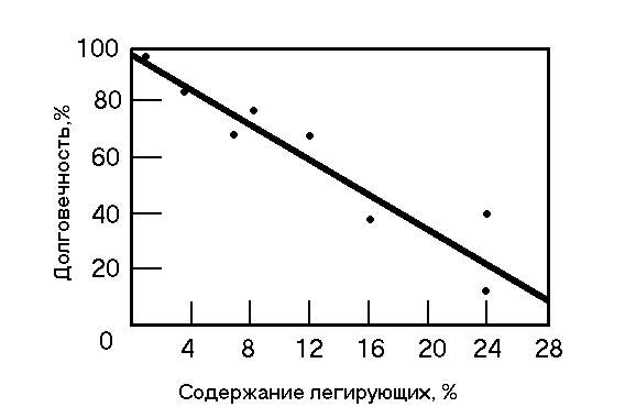 Рисунок 1 – Влияние суммарного содержания легирующих элементов на долговечность подшипниковых сталей. Изменение содержания составляющих сталь легирующих элементов оказывает различное влияние на свойства подшипников. Добавка молибдена оказывает положительное влияние на долговечность подшипников. В Японии были испытаны подшипниковые стали типа ШХ15 с содержанием 1-1.5% Si. Долговечность подшипников из этих сталей повышалась, однако они не получили применения из-за плохой обрабатываемости. Предлагаемая замена стали ШХ15 на сталь с пониженным содержанием хрома (85Cr1Mo) не была осуществлена, несмотря на более короткое время отжига, из-за пониженной (8 мм) прокаливаемости. Эту сталь целесообразно применять там, где требуется улучшенная деформируемость в холодном состоянии. Многими авторами было доказано благоприятное влияние повышенного содержания серы (до 0,15%) на долговечность и обрабатываемость подшипниковых сталей, хотя стали с таким содержанием серы пока не применяются. В подшипниковых сталях, полученных по обычной технологии, содержится около 0,005% О2, 0,01-0,02% N2, 0,0001-0,0005% Н2. Кислород находится в виде окислов и его количество зависит от технологии раскисления. При вакуумировании содержание кислорода уменьшается до 0,002%, а при ВДП – до 0,001%. Водород отрицательно влияет на качество стали ввиду того, что снижение растворимости его при снижении температуры металла вызывает повышенные локальные давления в металле, приводящие к образованию флокенов. При исследовании подшипниковых сталей отечественных и зарубежных фирм было установлено отрицательное влияние повышенных содержаний азота и суммы азота и кислорода на долговечность подшипников. Микропористость может приводить к образованию питтинга и снижению долговечности подшипника. Неметаллические включения в подшипниковых сталях являются концентраторами напряжений и могут в некоторых случаях являться причиной появления микротрещин, образующихся от повышенной концентрации мозаичных напряжений, резкого охлаждения при закалке и др.[6] в общем же случае стараются, чтобы неметаллические включения имели глобулярную форму. Наиболее пагубное воздействие на качество подшипников оказывают включения оксидов и нитридов алюминия. В настоящее время наиболее полно удовлетворяют требованиям по содержанию вредных включений стали, произведённые методами ЭШП и ВДП. Однако этот металл слишком дорогой и, кроме того, не установлены экономически целесообразные требования по чистоте металла. 2. Анализ способов выплавки шарикоподшипниковых сталей на Украине, в СНГ и за рубежом. 2.1 Общая характеристика способов выплавки. Наиболее распространёнными способами производства шарикоподшипниковых сталей являются: основной мартеновский, кислый мартеновский и электродуговой. Последний, по данным С.С. Штейнберга, был признан наиболее совершенным. Полагали, что в электропечи может быть выплавлен первосортный металл даже из относительно загрязнённых серой и фосфором материалов. Поэтому на заводах, на которых исходные материалы загрязнены серой и фосфором выше нормы, единственным агрегатом для выплавки первосортной стали была признана электропечь. Там же, где возможно получение чистых по сере и фосфору чугунов, равноценным агрегатом была признана кислая мартеновская печь. В настоящее время в с
