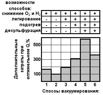 Рисунок 2 – Изменение затрат на вакуумную обработку в зависимости от количества обрабатываемого металла и применяемых способов обработки: 1-6 – способы вакуумирования: 1 – при обычной разливке, 2 – в ковше, 3- RH и DH, 4 – Финкл, 5 – ASEA-SKF, 6 – ВСШ Следует отметить, что возможности способа вакуумшлакового рафинирования не ограничиваются только стандартным вариантом обработки. Большие преимущества могут быть получены также при совмещении данного способа рафинирования с горизонтальными и радиальными МНЛЗ, с модифицированием металла редкоземельными и щелочноземельными металлами, при работе установки ВСШ в комплексе со сталеплавильными агрегатами (конвертор, САНД), обладающими повышенной производительностью. Снабжение установки приспособлением для подогрева металла в процессе или после обработки позволит вывести вакуумшлаковое рафинирование по эффективности на один уровень с дорогостоящим способом ASEA-SKF при значительно меньших затратах. [10] Многие исследования, проводимые в настоящее время, направлены уже даже не на совершенствование существующих технологий, а на разработку совершенно новых. Так в Японии находит ограниченное применение труднообрабатываемая жаропрочная быстрорежущая сталь SKH4A (18%W, 4%Cr, 1%Vn, 10%Co). [1] В США в последние годы создан новый жаропрочный материал для подшипников из нитрида кремния, долговечность которого на 300-800% выше долговечности обычных подшипниковых материалов, работающих в условиях высоких температур и в коррозионных средах. Исследования, выполненные в Америке, показали, что нитрид кремния, спрессованный в горячем состоянии, обеспечивает долговечность 5,7 вместо 1,8 млн. циклов в случае быстрорежущей инструментальной стали вакуумного переплава. Подшипник из нитрида кремния успешно работал при 9000С и скорости вращения вала 30 000 об/мин. [7] В конечном итоге, в настоящее время очень важным для подшипниковой промышленности является максимальное объединение усилий учёных и технологов различных отраслей: химиков, физиков, металлургов, конструкторов, и в первую очередь экономистов, как нашего государства, так и других стран для обеспечения неуклонного роста производства и дальнейшего развития технологии производства недорогих, и самое главное высококачественных и долговечных подшипников, как металлических, так и на основе композиционных материалов, и, в будущем, создания практически вечных подшипников, срок службы которых будет измеряться не десятками лет, а столетиями. 4. Выбор и рекомендации по использованию новых прогрессивных разработок в технологии выплавки шарикоподшипниковых сталей. Постоянно растущие требования к качеству стали могут сыть удовлетворены лишь при производстве металла с низкими содержаниями серы, кислорода, водорода и неметаллических включений. Но это связано со значительными трудностями: лишь способ обработки, получивший название ASEA-SKF (по названию двух разработавших его шведских фирм), позволяет комплексно рафинировать сталь, но это весьма дорогой и трудоемкий процесс. УкрНИИспецсталью совместно с заводом «Днепроспецсталь» и другими организациями разработаны способ и устройства для вакуумирования стали с одновременной обработкой в столбе синтетического шлака (УВСШ). Способ позволяет вакуумировать сталь в широком диапазоне, сочетая преимущества процессов вакуу