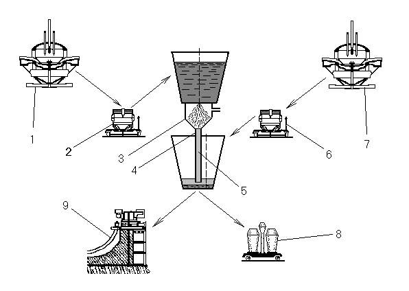Рисунок 3 – Схема способа вакуумирования с обработкой в столбе шлака: 1- сталеплавильная печь, 2 - передаточный ковш с исходным металлом, 3 - вакуумная камера, 4 – шлаковый рукав, 5 – столб жидкого шлака, 6 – приёмный ковш с синтетическим шлаком, 7- шлакоплавильная печь, 8- изложницы, 9- МНЛЗ. Как было установлено проведенными исследованиями, способ вакуумирования с одновременной обработкой в столбе шлака имеет ряд кинетических преимуществ перед другими способами обработки. Так, при вакуумировании наряду с дегазацией в струе наблюдается плёночное, капельное, или в виде мелких струй течение металла по стенкам и коническому днищу вакуумной камеры, что повышает эффективность дегазации. При движении металла через столб шлака происходит образование шлакометаллической эмульсии, в которой дисперсная фаза – металл – имеет размеры частиц в пределах 0,05-1,0 см, а максимальная масса капель имеет фракции размером 0,3-0,6 см. Поверхность контакта металла со шлаком в процессе обработки в столбе шлака составляет более 300 м2/т стали, что на много превышает аналогичный показатель для обработки синтетическим шлаком в ковше. Обработку в столбе шлака можно охарактеризовать как взаимодействие фаз при противотоке в случае, когда скорость движения одной из фаз (в данном случае шлака) близка к нулю. Поэтому эффективность удаления растворимых примесей из металла при обработке в столбе шлака выше, чем при традиционном перемешивании фаз в объёме (например, при обработке синтетическим шлаком в ковше). Повышению эффективности рафинирования способствует также тот факт, что металл после обработки не контактирует с загрязнённым шлаком, чем затрудняется обратный переход примесей из шлака в металл. На установке завода «Днепроспецсталь» обрабатывали подшипниковую сталь. Её выплавляли в 60-т печах переплавом отходов с продувкой кислородом, шлак в период доводки не раскисляли и перед выпуском металла из печи не удаляли. Все проведенные эксперименты и анализы плавок дали положительные результаты. [10] Экономический и народнохозяйственный эффекты применения данной технологии приведены выше. Учитывая все преимущества данной технологии перед остальными, можно считать, что в данный момент она является наиболее передовой и перспективной, а значит, следует предпринять все необходимые меры для быстрого и эффективного внедрения данной технологии на крупных промышленных предприятиях Украины, что позволит им успешно конкурировать с зарубежными металлургическими предприятиями, такими, например, как ASEA-SKF. Выводы. Проанализировав весь рассмотренный материал можно сделать следующие выводы: 1. Необходимо совершенствование критериев оценки качества металла и готовых изделий, а также повсеместное применение неразрушающих методов контроля. 2. Необходимо разработать и применять единую методику для оценки эксплуатационных свойств подшипниковых сталей, согласованную между представителями металлургической и подшипниковой промышленности. 3. Сортамент существующих подшипниковых сталей целесообразно совершенствовать путём введения в стандарт новых марок с молибденом и ванадием. 4. Наиболее перспективными в плане повышения качества стали в настоящее время являются специальные способы производства (ЭШП, ВДП, ЭЛП, ВСШ и др.). 5. Самой прогрессивной технологией, обладающей
