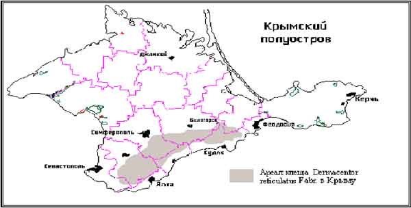 К характерным морфологическим признакам рода Dermacentor относится наличие светлых эмалевых пигментов в виде пятен различной формы и размеров, лучше всего выраженных на спинном щитке, и в меньшей мере - на ногах и хоботке. Форма эмалевых пятен и их количество весьма значительно варьирует в пределах одного вида и даже одной популяции (Померанцев Б.И., 1950, Померанцев, Матикашвили, 1940, Емчук Е.М, 1960). У разных видов рода имеются опре-деленные закономерности в развитии этого пигмента. D. daghestanicus - житель наиболее засушливых мест, почти совер-шенно белый. D. reticulatus и D. marginatus, населяющие местности с относительно большей влажностью, окрашены темнее. Можно предположить, что белый пигмент спинного щитка, характерный для рода Dermacentor, также является следствием происхождения этих клещей из мест, для которых характерны пониженная влажность воздуха и повышенная инсоляция. Многие факты подтверждают предположение о существовании связи между окраской клещей и количеством осадков. Большое значение имеют микроклиматы тех мест, где проходят свое разви-тие молодые фазы клещей, в частности их нимфы (Резник, 1970). Виды рода Dermacentor характеризуются вполне определенными требованиями к гидротермическим условиям среды обитания, что проявляется в при-уроченности к определенным природно-климатическим зонам и типам биотопов. Распределение клещей в пределах своего ареала на территории полуострова крайне неравномерное и носит ярко выраженный агрегированный характер. Клещи образуют локальные очажки с более высокой численностью в стациях, характеризующихся оптимальными для вида экологическими условиями, к которым приспособился данный вид в процессе филогенетического развития. В Крыму по комплексу характеристик, включающих особенности климата, ландшафта, растительности и др., наиболее естественно выделение трех крупных ландшафтно-географических единиц: горно-лесной и равнинно-степной зон и территории Керченского полуострова (Кочкин, 1967, Геоботанiчне районування:, 1977). По гидротермическим условиям для большинства видов клещей с пастбищным типом паразитирования наиболее благоприятны лесистая территория горного и предгорного Крыма, которая занимает около 20% площади полуострова и характеризуется наличием множества разнообразных природных биотопов, образованных как травянистой, так и древесно-кустарниковой растительностью, со всеми промежуточными типами. Для данной зоны характерна повышенная влажность (выпадает 600-1000 мм осадков), что благоприятствует длительному выживанию клещей (Кочкин, 1967). Равнинно-степной Крым занимает около 70% площади Крымского полуострова. Отличительной чертой этого района является плоский рельеф, господство культурного ландшафта, малое количество осадков, низкая относительная влажность воздуха, что в целом создает неблагоприятные условия для клещей (Геоботанiчне районування, 1977). Промежуточное положение по условиям существования для клещей занимает Керченский полуостров, территория которого составляет около 1/10 площади полуострова. Значительная пересеченность рельефа благоприятствует сохранению здесь больших нераспаханных участков, которые используются для выпаса скота, что создает благоприятные условия для развития иксодовых клещей. Район характеризуется засушливостью (годовая сумма осадков колеблется в пределах 27