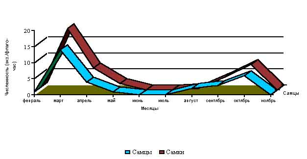 В местах с наиболее оптимальными условиями существования встречалось до 50-80 экз. на 1 флаго/час и больше. В апреле численность клещей снижается в три раза по сравнению с мартом, а в июне - еще в три раза по сравнению с маем. Причин такой динамики несколько. Во-первых, самки, нашедшие хозяев и успешно завершившие питание, уходят в подстилку, где начинают откладку яиц, после чего они погибают. Во-вторых, постоянно происходит естественная гибель особей от хищников, неблагоприятных климатических факторов и других причин. В-третьих, постепенно происходит повышение среднесуточных температур, сильно повышается сухость воздуха, что неблагоприятно влияет на активность клещей. В летние месяцы, характеризующиеся жаркой и сухой погодой (июнь - первая половина августа), оставшиеся в живых клещи покидают растительность и укрываются от неблагоприятного воздействия высоких температур, низкой влажности воздуха и сильной инсоляции в подстилке, впадая в летнюю диапаузу. После снижения среднесуточных температур и выпадения дождей, характерных для конца августа, происходит активизация клещей, что выражается в постепенном нарастании их численности вплоть до середины октября. Хотя суммарная численность имаго в популяциях в данный период намного выше таковой чем весной, однако большинство клещей нового поколения не активизируются и не покидают подстилку. С конца октября и в ноябре, когда температура становится отрицательной, клещи снова покидают растительность и укрываются в расщелинах почвы, подстилке и других укромных местах, где и зимуют. Отдельные особи клещей, в связи с нередкими для Крыма теплыми и погожими "окнами", которые случаются в ноябре-декабре, могут активизироваться и встречаться в активном состоянии на остатках травянистых растений и кустарниках. Динамика численности D. reticulatus аналогична предыдущему виду (см табл. ). Только в связи с тем, что в верхнем поясе гор весной теплая погода устанавливается позже, соответственно и сроки активности клещей смещены на более поздние сроки. Так активизация клещей после зимовки происходит в марте, достигая своего пика в апреле, а с мая снижается, падая почти до нуля. Осенняя динамика активности клещей D. reticulatus примерно соответствует таковой клещей D. marginatus. Осенние волны заклещевления, как пра-вило, бывают менее выраженными, чем весенние. Отличительной особенностью клещей D. marginatus является их способность зимо-вать на хозяине, в то время как зимующих D. reticulatus на животных не обнаружено (Резник, 1970). Сборы, сделанные в холодное время года, мо-гут быть довольно обильными и содержать напившихся самок (зимовать остаются самки, присо-савшиеся поздно осенью) (Галузо, 1948). Близкие данные по фенологии клещей отмечены и в других районах ареала (Адамович, 1961, Галузо, 1948, Разумова 1962, Ганиев, 1956). Однако иногда отмечаемое исследователями превышение осеннего пика численности над весенним (Сапегина, 1965, Богданов и др., 1964), в Крыму не наблюдалось. Длитель-ность обеих волн сезонной активности более или менее одинакова и продол-жается около двух месяцев (Логиновский, l966). Поведенческая и репродуктивная диапаузы регу-лируются длиной светового дня. Для D. marginatus характерна короткодневная фотопериодическая реакция с критическим фотопериодом в 13 ч (Бе-лозеров, 1976). Экологическое значение обеих форм диапаузы однозначно и 