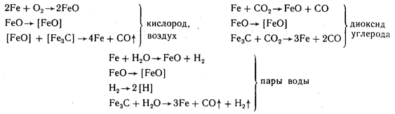 В зависимости от температуры для одного и того же окисляющегося металла проявляются различные законы роста пленкиоксида. Например, для титана при низких температурах выполняется логарифмический закон роста пленки; она пассивирует его очень стабильно. При 900—1100К он окисляется уже по параболическому закону, т. е. пассивируется частично, а при более .высоких температурах окисляется по линейному закону, т. е. пленка оксидов перестает быть защитной (Н. Д. Томашев). Строение оксидных пленок очень сложно и зависит от характера образующихся между металлом и кислородом соединений и процессов диффузии. Процессы диффузии в оксидных слоях могут происходить за счет перемещения ионов кислорода O2- от газовой фазы по направлению к металлу или ионов Ме+ в противоположном направлении. Ионы перемещаются по вакансиям в кристаллических решетках оксидов. Если в толще образовавшейся пленки преимущественно движутся ионы O2-, то это приводит к утолщению пленки за счет уменьшения толщины металла, т. е. общая толщина коррелирующего образца практически не изменяется. Наоборот, если преимущественно перемещаются ионы Ме+, то пленка растет в направлении газовой фазы (O2) и размер корроди-рующего образца растет. Может быть и промежуточный случай — одновременного движения ионов O2- и Ме+, что вызывает рост пленки в обоих направлениях. Диффузия ионов создает неравномерное электрическое поле вблизи поверхности металла Оксидные, нитридные и другие пленки на металлах обычно приобретают свойства полупроводимости. Сложный теоретический вопрос о развитии оксидных и иных слоев на поверхности металлов имеет практическое значение в технологии машиностроения, так как изменение размеров деталей после их оксидирования необходимо учитывать (допуск на обработку). У металлов с переменной степенью окисления строение пленки по толщине неодинаковое. Наилучшие по стойкости оксидные пленки обладают структурой шпинелей RO *R2O2; образуясь на поверхности сплавов (IХ18Н9), они служат надежной защитой от коррозии (FeO * Cr2O3 или NiO * Cr2O3). Практически вообще не пасси-вируются при высоких температурах d-металлы с высокими степенями окисления, образующие летучие оксиды: Мо, W, Nb, Та, Rе. Температуры кипения их оксидов ниже температур плавления соответствующих металлов, и поэтому оксиды улетают в газовую фазу, обнажая поверхность металла для дальнейшего окисления. Изменение состава металла в результате газовой коррозии. Если образование оксидного слоя при высокой температуре сопровождается интенсивной диффузией кислорода внутрь металла, то это приводит к изменению его состава за счет окисления легирующих компонентов. Особенно это заметно на конструкционных сталях, в поверхностных слоях которых происходит окисление углерода — ферритная полоска, образование которой сопровождается потерей прочности, особенно для тонкостенных изделий. Взаимодействие сталей с окисляющими средами можно представить в виде следующих уравнений: