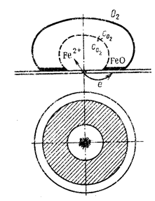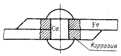 Рис. 1. Разрушение в месте контакта разных металлов Если возникновение разности потенциалов вызвано применением эвтектических сплавов, состоящих из металлов различной активности, то не всегда можно руководствоваться данными по стандартным потенциалам растворения, так как активность изменяется в зависимости от состава электролита и рН среды. Так, например, стандартный потенциал алюминия меньше стандартного потенциала цинка, а в растворе поваренной соли получается наоборот — eА1>eZn, и в данной паре цинк будет анодом. При контакте эвтектического сплава с электролитом может быть два случая: 1) коррозия сведется квытравливанию из поверхностного слоя одного из компонентов (селективная коррозия); 2) коррозия может перейти в интеркристаллитную, если наиболее активный элемент входит только в состав эвтектики, разделяющей кристаллические зерна металлов. В сплавах металлов А и В, обладающих разной активностью (eА<eB), сплав состава 1—1 будет подвергаться селективной коррозии, а сплав состава 2—2 — интеркристаллитной, потому что активный металл А весь входит в состав эвтектики. Ввиду малой поверхности зерен А в эвтектике плотность тока будет большая и разрушение эвтектики пойдет в глубину. Поэтому рекомендуется в коррозионных средах применять только сплавы типа твердого раствора (Л-61, IХ18Н10 и т. д.). Сам процесс взаимодействия металлов с электролитной средой может происходить или с водородной, или с кислородной деполяризацией в зависимости от рН среды. Различные концентрации электролита могут вызвать коррозию, создавая пару даже с одинаковыми металлами. Различное содержание кислорода также приводит к образованию гальванической пары — менее окисленный и более окисленный металл. Примером может служить коррозия металла под каплей воды (точечная коррозия, переходящая в питтинг); схема этого процесса приведена на рис. 2.