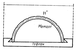 Рис. 2. Коррозия стали под неподвижной каплей воды Поверхностные слои воды содержат больше кислорода, чем внутренние, и поэтому средняя часть смоченного металла оказывается более активной (анод), чем внешняя (катод). После высыхания капли в ее центре появляется довольно глубокое пятно ржавчины. Если взять достаточно тонкую (0,2—0,1 мм) пластинку, например стали, то можно получить сквозное отверстие. Такие процессы часто наблюдаются при атмосферной или почвенной коррозии. Коррозионные пары могут возникать при действии внешних или внутренних механических напряжений (остаточных напряжений, например при сварке). Если пластинку стали, дюраля или титанового сплава согнуть и в напряженном состоянии погрузить в коррозионную среду, то на растянутом слое (внешний) через относительно короткое время возникнут трещины (рис. 3), а внутренний сжатый слой будет оставаться без изменений. Растягивающие усилия особенно опасны, так как в этом случае металл повышает свою активность.