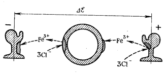 Рис. 3. Коррозия пластинки в напряженном состоянии Если согнутую упруго пластинку (см. рис. 3) термически обработать и упругие деформации перейдут в пластические (явление релаксации), то разности потенциалов не возникает. Таким образом, при изготовлении деталей и узлов машин для снятия остаточных напряжений всегда следует термически обрабатывать изделия, если эти изделия предназначены для работы в сильно коррелирующих средах. ЭЛЕКТРОХИМИЧЕСКАЯ КОРРОЗИЯ, ВОЗНИКАЮЩАЯ ПОД ДЕЙСТВИЕМ ВНЕШНЕЙ РАЗНОСТИ ПОТЕНЦИАЛОВЭксплуатация деталей и узлов машин в коррозионной среде под действием наложенной разности потенциалов встречается очень редко, но может быть случайное возникновение разности потенциалов за счет нарушения изоляции, утечки тока из соседних электрических линий и т. д. Эти случайно наложенные разности потенциалов могут приводить к опасным коррозионным разрушениям, обычно локального типа. Очень часто возникновение падения потенциала в почвах создается за счет электрического рельсового транспорта. Транспорт троллейбусного типа, работающий на двух фазах (+ и -), обычно при нормальной эксплуатации опасности не представляет. Рассмотрим коррозионное разрушение закладных металлических конструкций (трубы, детали фундаментов, кабели) под действием утечки тока, например, с трамвайного рельсового пути, который заглублен в грунт и может иметь высокое электрическое сопротивление за счет плохо проводящих электрический ток стыков рельс. В этом случае при хорошо проводящей влажной почве возможно разветвление тока, причем часть его пойдет через почву кратчайшим путем. На рис. 4 показана схема ответвления тока с трамвайного рельса, который является обычно отрицательным полюсом (+ на проводе). На пути так называемого «блуждающего» тока может находиться металлическое сооружение — плохо изолированная труба. Примем условно, что электролит, пропитывающий почву, содержит ионыCl-, Fe3+ и Na+. Электроны, выходящие из металла (рельса), по электролиту перемещаться не могут и в месте выхода их из рельса разряжаются ионы Н+ или Fe3+ (что может привести даже к наращиванию рельса выделившимся железом). Ионы хлора будут перемещаться по почве, подходить к трубе и, разряжаясь, переводить металл в раствор; на выходе электронов из металла (трубы) также не будет коррозии, тогда как на входе в рельс ионы хлора будут вызывать коррозию. Аналогичные явления могут наблюдаться и при переменном токе, но они менее опасны.