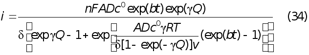 Левая полуширина пика, используемая как критерий обратимости, в этой модели для обратимого процесса составляет 0.056/n, В. Делахеем и Берзинсом [9] была найдена функция, определяющая форму вольтамперной кривой в случае обратимого растворения объемного осадка металла (активность осадка принимается равной 1). В этом случае краевое условие принимает вид