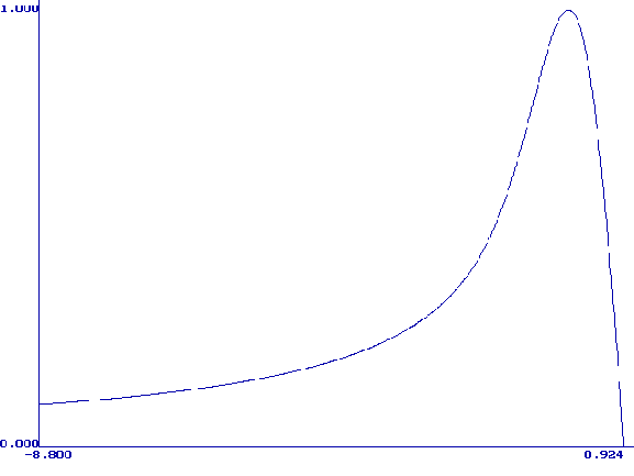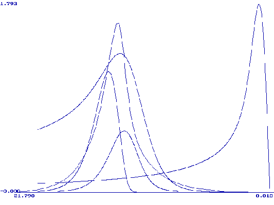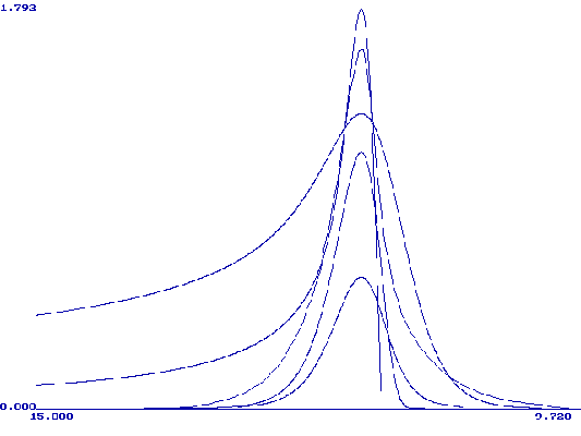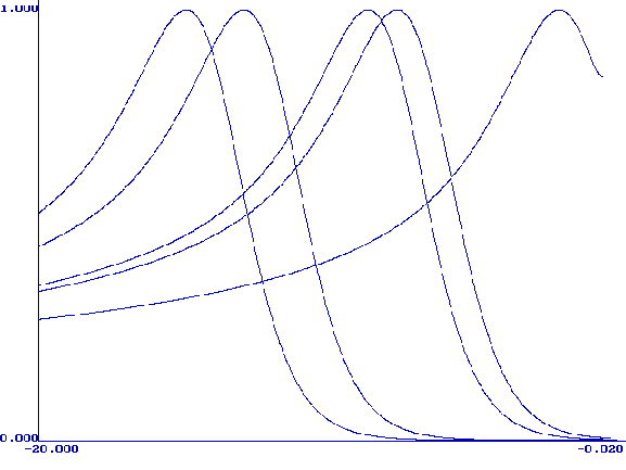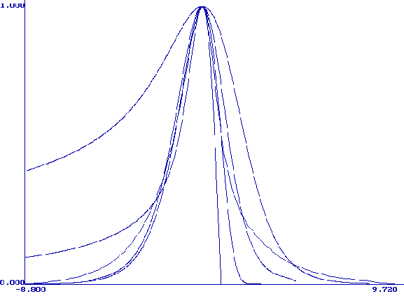 Рис. 2. Нормированные по высоте пиков графики функции (9) при следующих значениях ln(xq): 1(1), 6.5(2), 7.5(3), 11.8(4), 13.8(5). Модель М. Никольсон описывает форму вольтамперной кривой при растворении монослоя металла с поверхности твердого электрода. Кривая описывается уравнением (21) в интегральной форме. Форму вольтамперной кривой описывает первая производная функции y(bt). Были составлены таблицы значений yў(bt) при разных значениях H. На рис. 3 приведены нормированные (все максимумы сведены в точку (0;1)) графики функции yў(bt) при H=0.1, 1, 3, 10, 100, 1000, 10000, 170000. Из этого рисунка видно, что при больших H форма кривой становится постоянной. Высота максимума при Hі100 почти не меняется (0.298±0.002), а потенциал максимума смещается в область более положительных значений согласно уравнению (26):