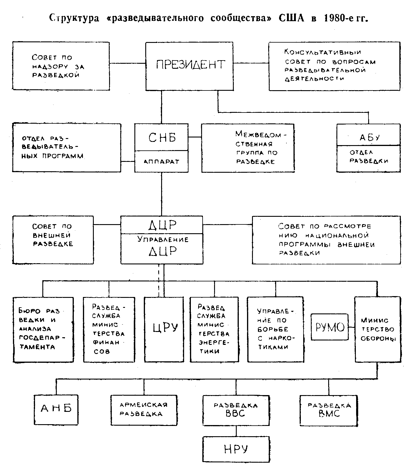 Реферат: Принятие политических решений: Создание СНБ и деятельность в период администрации Р РейганаРеферат: Принятие политических решений: Создание СНБ и деятельность в период администрации Р РейганаЧасть I Создание СНБ и его деятельность в период администрации Трумэна, 1947-1953гг. Важное место во внешнеполитическом механизме США занимает Совет национальной безопасности (СНБ) — консультативный орган при президенте. За всё время существования его значение и роль менялись с приходом каждой новой администрации. За эти годы была создана целая система СНБ. Тревожные военные годы заставили правительственные и военные круги усиленно искать новые методы руководства вооруженными силами и планирования политики. В 1943 г. начальник штаба армии Дж. Маршалл беседовал по этому вопросу с У. Черчиллем, который предложил создать соответствующий орган в американской системе по образцу Британского военного кабинета. Чуть позже он прислал описание механизма его действия. Ознакомив с полученным документом Г. Гопкинса и адмирала В. Леги, Дж. Маршалл стал энергично отстаивать идею создания подобного органа перед президентом Рузвельтом и военными министрами. Министр военно-морских сил Дж. Форрестол увидел в этом возможность объединения вооруженных сил в одно министерство и создания единого планирующего и координирующего органа. По его инициативе была создана небольшая группа во главе с Ф. Эберштадтом, бывшим в то время вице-президентом Управления военного снаряжения, которая в течение длительного времени изучала опыт Имперского совета обороны, существующего в Англии с 1908 г. Особое внимание было обращено на то, что Имперский совет не представлял премьер-министру свою программу действий, а лишь собирал и классифицировал полученную информацию. В декабре 1945 г. Г. Трумэн в специальном послании конгрессу высказал свои соображения по поводу организации системы национальной безопасности. Ключевыми вопросами доклада были: объединение вооруженных сил и создание Совета национальной безопасности. Через полтора года Белый дом опубликовал программу национальной безопасности, в которой большое внимание уделялось развитию возможных видов вооружения и всеобщей воинской повинности. В целях координации при разработке единой политики национальной безопасности в разведывательной деятельности и в вопросах военной, промышленной и гражданской мобилизации предусматривалось создание Совета национальной безопасности, Центрального разведывательного управления и Управления ресурсов национальной обороны. Наконец после долгого обсуждения 26 июля 1947 г. Трумэн подписал законопроект, и Закон о национальной безопасности 1947 под № 253 вступил в силу. В соответствии с этим законом были созданы министерство обороны, Совет национальной безопасности, Центральное разведывательное управление, подчиненное СНБ, и Управление ресурсов национальной обороны.1 Совет национальной безопасности должен был консультировать президента по всем аспектам внутренней, внешней и военной политики, касающейся вопросов национальной безопасности, в целях более эффективной координации деятельности военных ведомств и других правительственных департаментов и учреждений. Большое место в работе Совета должно быть уделено оценке действительной и потенциальной военной мощи стра