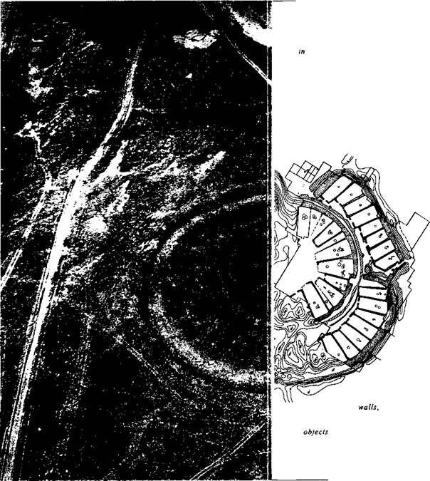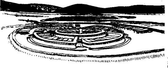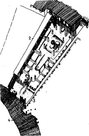 Поселение Аркаим. Северо-западный вход. Привратная башня и участок радиальной стены. Реконструкция. Рисунок ЛЛ.Гуревича Стена внутреннего круга (назовем ее стеной цитадели) имела диаметр 85 м и толщину 3-4 м. Она менее массивна, по сравнению с внешней стеной, однако не исключено, что по высоте превышала ее. Судя по сохранившейся глиняной обмазке, стена цитадели была строго вертикальной. Ясно, что подобная конструкция могла быть возведена только с помощью значительного количества дерева. Как отмечалось, стену цитадели опоясывала круговая улица. С внутренней стороны к стене вплотную примыкали торцы домов центрального жилого кольца. Жилища, так же как и во внешнем круге, располагались радиально, но с выходом на центральную площадь. Перед домами тоже были небольшие дворики или крытые галереи. Нужно отметить, что забора из грунтовых блоков здесь не было, но сохранилось большое количество столбовых конструкций. Центральная площадь представляла собой плоскую прямоугольную площадку, которая была ориентирована на северо-восток. В центре ее расположены два продолговатых понижения, соприкасающихся между собой и окруженных небольшим по высоте барьером. Вся площадка окружена узкой канавкой. Раскопки позволили выявить примерные размеры центральной площади - 27 х 25 м. Она была тщательно выровнена, утрамбована и, вероятно, покрыта специальным цементирующим раствором. По краям по кругу располагались зольники. Не исключено, что это следы от огня, горевшего в древности здесь же, на площади. Насколько можно судить по современному рельефу, поселок имел четыре входа, обращенных на ЗСЗ, ВЮВ, ССЗ, ЮЮВ. Главный, западный, вход отмечен разрывом (в 40 м) кольца внешней стены. Стена и ров резко поворачивают в глубину поселка, смыкаясь с конструкциями цитадели. В настоящее время полностью раскопан северо-западный вход. Конструкция его оказалась настолько сложна, что описать ее весьма не просто. Обводная стена и ров делали прогиб, обращенный внутрь поселка примерно на 7-8 м. Однако на участке наибольшего излома ров не только не прервался, как мы ожидали, а, наоборот, оказался и широким, и глубоким. А по другую сторону рва, со стороны поселения, сохранился мощный фундамент башни, которую с полным основанием можно назвать «надвратной». В общем - это был ложный вход. Чужестранцы, не знакомые с местной фортификацией, подобно нам устремившиеся в прогибы стен в поисках прохода в крепость, могли попасть под град стрел, которые бы летели с трех сторон, да еще при хорошо продуманной системе навесного и подошвенного боя. Подлинный вход был обнаружен с торца западного отрезка оборонительной стены, где стена и ров делали резкий поворот на юго-восток. Здесь ров прерывался на ширину 2,5 - 3 м. Этот проход совпадал со входом в коридор, который был проложен внутри оборонительной стены. Фактически это был туннель, построенный в виде лабиринта. Первоначально он имел ширину 1, 5 м, затем расширялся до 3 м, потом снова сужался выступом внешней стены. Только преодолев этот участок, вы могли попасть на открытую и более или менее свободную площадку у основания предвратной башни. С трех сторон площадка была ограничена стенами, а с одной – обращена к широкому проходу, ведущему вдоль радиальной оборонительной стены на круговую улицу. Однако по этому проходу можно было передвигаться только в 