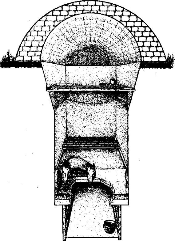 Могильник Большекараганский (Аркаим). Курган 25, яма 24. Реконструкция погребального сооружения. Рисунок А.М. Федорова миф, выраженный средствами архитектуры. По материалам полевых исследований нами сделана реконструкция ямы 24. Яма была сооружена на последнем этапе функционирования комплекса в углублении кольцевого рва, который к тому времени уже примерно на одну треть глубины заполнился почвенными частицами. Глубина ямы превышает 3,5 м от уровня древней поверхности. На дне ямы помещается полая погребальная камера высотой 65-70 см, с размерами 2, 1 х 1, 2 м. Стенки камеры облицованы деревом. Камера имеет перекрытие из двух слоев деревянных плах, плахи из верхнего слоя обожжены в огне, причем еще до их использования в конструкции. На перекрытии лежат остатки жертвенных животных, пространство «жертвенной камеры» заполнено глиной. Выше располагается обширная, высотой около 1,5 м полая камера, перекрытая вверху еще одним слоем дерева. Сверху на перекрытие ямы насыпан слой грунта таким образом, что углубление рва в районе ямы сравнялось с окружающей поверхностью. На образовавшейся площадке возведено сооружение из глинобитных блоков в виде ложно-сводчатого купола. Интересные сюжеты реконструкций могут быть связаны с обнаружением на погребальных комплексах остатков животных, преимущественно домашних (лошадь, крупный и мелкий рогатый скот, собака, кабан). Эти находки, вероятно, объясняются «общеиндоевропейским представлением о загробном мире как пастбище, на котором пасутся души скота и жертвенных животных». Всего на комплексе 25 обнаружены остатки не менее 110 особей животных, представленных в основном черепами и костями конечностей; другие части туш встречаются сравнительно редко, мало (в отличие от синташтинской традиции) и целых туш животных. Таким образом, типичная для аркаимских некрополей практика жертвоприношений предполагает разделение жертвенного животного на три части: ритуальный «верх», среднюю часть и ритуальный «низ». Выделяется несколько типов жертвенников: сопроводительные, поминально-именные и поминально-родовые. Сопроводительные жертвенники располагаются на перекрытиях погребальных камер и являются остатками животных, забитых непосредственно во время ритуала похорон. Поминально-именные жертвенники сооружаются в небольших углублениях на древней поверхности у краев могильных ям. Такие жертвенники были адресованы конкретному погребенному, они могли сооружаться как одновременно с возведением надмогильной конструкции, так и позднее. К поминально-родовым жертвенникам мы относим жертвенники, устроенные в специальных крупных ямах, образующих планиграфически две дуги на южной периферии комплекса. В этом случае жертвоприношения и связанные с ними моления, вероятно, были обращены к какому-то обобщенному субъекту, скорее всего, к совокупности родовых предков. Южное расположение поминально-родовых жертвенников в микрокосме погребального комплекса позволяет предположить, что «страна предков» помещалась «аркаимцами» на юге. Интересно, что все поминально-родовые жертвенники, для которых удалось выяснить их внугригодичную датировку, были сооружены в весенний период. Таким образом, мы встречаемся здесь со следами сезонных обрядов почитания предков; такие обряды характерны для древних индоевропейцев. Судя по 