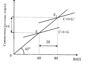 Рис. Мультипликатор государственных расходов Пусть объем государственных расходов вырос на 10 млрд. р., следовательно прямая С + I + G сдвигается вверх на 10 млрд. р. Теперь состояние макроэкономического равновесия будет достигаться в точке Е1, в которой ВНП уже составляет 80 млрд. р. Таким образом, приращение государственных расходов на 10 млрд. р. привело к увеличению ВНП на 20 млрд. р. Исходя из этого можно сказать, что МРG в данном случае равен 2. По сути дела, МРG по своей модели полностью совпадает с мультипликатором инвестиций. И если исходить из того, что МРС=1/2, то МРG= I /(I-MPC)=2. где MPC – предельная склонность к потреблению. Каждый рубль, израсходованный государством на закупку товаров и услуг, увеличил ВНП на 2р., т. е. вызвал приращение вторичных расходов в народном хозяйстве. Таким образом, рост объема государственных закупок увеличивает равновесный уровень выпуска продукции. Подобный механизм влияния государственных закупок на выпуск продукции предполагает, что во время спада государственные закупки могут быть использованы для того, чтобы увеличить выпуск продукции. И, наоборот, в период бума правительство может снизить уровень своих расходов, сократив тем самым объем совокупного спроса и выпуска продукции. Список литературы: 1. Е. Гайдар. Государственная нагрузка на экономику., журнал «Вопросы экономики», 2004 №9, стр.4. 2. Илларионов А., Пивоварова Н. Размеры государства и экономический рост., журнал «Вопросы экономики», 2002, № 9, с. 18-45. 3. Р. Нигматулин - Об оптимальной доле государственных расходов в ВВП и темпах экономического роста., журнал «Вопросы экономики» 2003, №3. 125-131. 4. Курс экономической теории, МГУ им.Ломоносова, Москва 2004г, стр.271-279. 5. Курс экономической теории, под редакцией проф. Чепурина М.Н., проф. Киселевой Е.А. Киров «АСА»,2004, стр.404,448,527. Министерство образования Российской Федерации Российский Государственный Социальный Университет Доклад по экономической теории: «Воздействие государственных расходов и налогов на экономическую динамику. Мультипликатор государственных расходов» Подготовила: студентка 1-го курса МОС-Д-1-1 Кипучева Мария Юрьевна Проверил: Солодуха Петр Викторович Москва 2005 [1] Е. Гайдар. Государственная нагрузка на экономику., журнал «Вопросы экономики», 2004 №9, стр.4. [2] Илларионов А., Пивоварова Н. Размеры государства и экономический рост., журнал «Вопросы экономики», 2002, № 9, с. 18-45. [3] Р. Нигматулин - Об оптимальной доле государственных расходов в ВВП и темпах экономического роста., журнал «Вопросы экономики» 2003, №3. 125-131. |