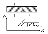 равна Полученные результаты можно наглядно представить с помощью энергетической диаграммы. Будем откладывать по вертикальной оси потенциальную энергию электрона внутри металла, равную W=eU (e – заряд электрона, U – значение потенциала), а по горизонтальной оси – перемещение вдоль металла. Тогда получится распределение энергии, изображенное на рис. 2. Так в отсутствии тока потенциал внутри металла одинаков, то энергия W постоянна в разных точках одного и того же металла. Однако ее значение в обоих металлах различно и меньше в металле 1, заряженном положительно, нежели в проводнике 2 (так как заряд электрона e<0). Разность энергий электрона в обоих проводниках равна eUвнутр. Вычислим теперь величину внутренней контактной разности потенциалов. В классической электронной теории задача о равновесии