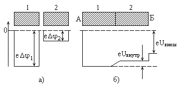 Возникновение внутренней контактной разности объясняется следующим образом. Рассмотрим два различных металла 1 и 2 (рис.2), находящихся при одной и той же температуре, и предположим, что мы привели их в соприкосновение. Электроны проводимости вследствие теплового движения будут переходить из проводника 1 в проводник 2 и обратно. Так как концентрация электронов в обоих металлах различна, то и диффузионные потоки электронов будут неодинаковыми. Рис. 2. Контакт двух различных проводников и распределение потенциальной энергии электронов. Положим, что концентрация электронов в металле 1 больше концентрации в металле 2. Тогда поток диффузии электронов из металла 1 будет больше потока диффузии в обратном направлении, и он будет заряжаться положительно, а металл 2 – отрицательно. В результате этого между металлами возникает разность потенциалов и появится электрическое поле, которое вызовет дополнительное движение электронов (переносное, или дрейфовое движение) в обратном направлении – от металла 2 к металлу 1, поэтому общее количество электронов, переходящих от 1 к 2, будет уменьшаться, а идущих в противоположенном направлении – увеличиваться. При некоторой внутренней контактной разности потенциалов Uвнутр между металлами установится равновесие и потенциалы металлов не будут уже изменяться. Эта разность потенциалов и является внутренней контактной разностью потенциалов обоих металлов. Отметим, что вследствие большой тепловой скорости электронов обмен электронами происходит весьма быстро и равновесие устанавливается уже в ничтожные доли секунды. Согласно закону Ома плотность тока внутри металла