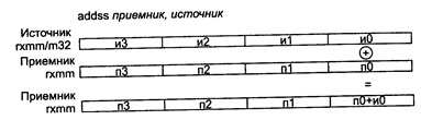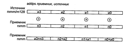 Конструируя команду на основе подобной синтаксической диаграммы, нужно помнить о соответствии типов. Допустимы только следующие сочетания: "r8, m8", "r16, m16", "r32, m32", а сочетание, например, "r8, m16" недопустимо. Однако, есть единичные случаи, когда подобные сочетания возможны; тогда они оговариваются специальным образом. Описание машинного кода приводится в двух вариантах. • В двоичном виде. Это описание применяется для демонстрации особенностей внутренней структуры машинной команды. Байты машинного представления машинной команды отделяются двоеточием. • В шеснадцатеричном виде. Каждый байт машинного представления команды представлен двумя шестнадцатеричными цифрами. Часто за одним (двумя и более) первым байтом следует обозначение: /цифра. Это означает, что поле reg в байте mod r/m используется как часть кода операции и цифра представляет содержимое этого поля. Вместо цифры может стоять символ "r" — /r. Как уже не раз отмечалось, большинство команд процессора — двухоперандные. Один операнд располагается в регистре, местоположение другого операнда определяет байт ModR/M — это может быть либо регистр, либо ячейка памяти. Более того, если операнд — ячейка памяти, то содержимое байта ModR/M определяет номенклатуру компонентов машинного кода команды, которые должны использоваться для вычисления эффективного адреса. При описании команд могут быть опущены некоторые из перечисленных пунктов. Например, отсутствие пункта "синтаксис" говорит о том, что он совпадает со схемой команды. Отсутствие пункта "исключения" означает, что при выполнении данной команды исключения не возникают. То же касается описания флагов. Некоторые регистры программной модели процессора имеют внутреннюю структуру. Указание того, о каком поле такого регистра идет речь, показано следующим образом: имя_регистра.имя_поля. 6.1. Команды блока XMM (SSE – Pentium 3) ADDPS приемник, источник ADDPS (ADDition Packed Single-precision float-point) — сложение упакованных значений в формате ХММ. Синтаксис: ADDPS rxmm1, rxmm2/m128 Машинный код: 00001111:01011000:mod rxmm1 r/m Действие: алгоритм работы команды показан на рисунке ниже.