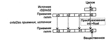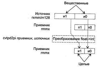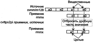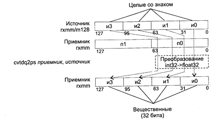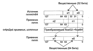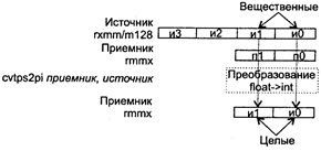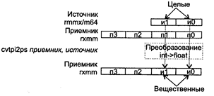 При возникновении незамаскированных исключений значение EFLAGS не изменяется. Исключения: NE: #I, #D; PM: #AC(0); #GP(0): 37; #NM: 3; #PF(fault-code); #SS(0): 13; #UD: 10-13; #XM; RM: #GP: 13; #NM: 3; #UD: 17-20; #ХМ; VM: исключения реального режима; #АС(0); #PF(fault-code). CVTPI2PS приемник, источник CVTPI2PS (Conversion Two Packed signed Int32 to Packed Single-precision float-point) — преобразование двух упакованных 32-битных целых в два упакованных вещественных значения. Синтаксис: CVTP12PS rxmm1, rmmx2/m64 Машинный код: 00001111:00101010:mod rxmm1 r/m Действие: алгоритм работы команды показан на рисунке ниже.