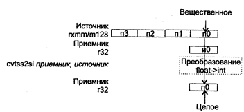 В случае когда не удается выполнить точное преобразование, значение округляется в соответствии с полем MXCSR.RC. Исключения: NE: #Р; РМ: #АС(0); #GP(0): 37; #NM: 3; #PF(fault-code); #SS(0): 13; #UD: 10-13; #XM; RM: #GP: 13; #NM: 3; #UD: 17-20; #ХМ; VM: исключения реального режима; #АС(0); #PF(fault-code). CVTSS2SI приемник, источник CVTSS2SI (ConVerT Scalar Single-precision float-point to Scalar signed Int32) -скалярное преобразование вещественного целого в 32-битное знаковое целое. Синтаксис: CVTSS2SI r32,rxmm/m128 Машинный код: 11110011:00001111:00101101 :mod r32 r/m Действие: значение источника хранится в младшем двойном слове регистра ХММ или в 128-битной ячейке памяти. Приемник — один из 32-битных регистров. Алгоритм работы команды показан на рисунке ниже.
