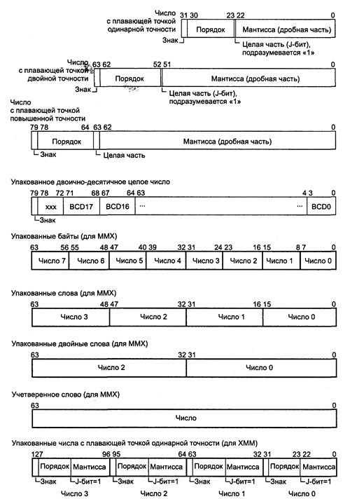 Рис. 2. Типы данных, обрабатываемых блоками FPU/MMX и ХММ При отсутствии математического сопроцессора прикладная программа все-таки может использовать инструкции FPU, но для этого операционная система должна поддерживать эмуляцию сопроцессора. Эмулятор сопроцессора — это программа-обработчик прерывания от сопроцессора или исключения #NM, которая должна "выловить" код операции, сопроцессора, определить местонахождение данных и выполнить требуемые вычисления, используя целочисленную арифметику центрального процессора. Понятно, что эмуляция будет выполняться во много раз медленнее, чем те же действия, выполняемые настоящим сопроцессором. Тем не менее эмуляция позволяет все-таки пользоваться прикладными программами, требующими вычислений с плавающей точкой. Для этого в регистре CR0 должно быть установлено сочетание флагов ЕМ = 1, МР = 0. Для эмуляции в IBM PC обычно устанавливают значение NE = 0. Тогда каждая инструкция FPU автоматически будет вызывать эмулятор генерацией запроса прерывания (а не исключения #NM, как было бы при NE = 1). Эмуляция для блоков ММХ и ХММ не предусматривается — эти блоки предназначены для ускорения вычислений в приложениях реального времени, и выполнять их с крайне низкой скоростью эмуляции было бы просто бессмысленно. Если установлен флаг эмуляции ЕМ = 1, то любая инструкция ММХ вызовет исключение #UD. 2. Математический сопроцессор x87 Математический сопроцессор предназначен для расширения вычислительных возможностей центрального процессора — выполнения арифметических операций, вычисления основных математических функции (тригонометрических, экспоненты, логарифма) и т. д. В разных поколениях процессоров он назывался по-разному — FPU (Floating Point Unit — блок чисел с плавающей точкой) или NPX (Numeric Processor eXtension — числовое расширение процессора). Сопроцессор поддерживает семь типов данных: 16-, 32-, 64-битные целые числа; 32-, 64-, 80-битные числа с плавающей точкой и 18-разрядные числа в двоично-десятичном формате. Формат чисел с плавающей точкой соответствует стандартам IEEE 754 и 854. Применение сопроцессора повышает производительность вычислений в сотни раз. С программной точки зрения сопроцессор и процессор выглядят как единое целое. В современных (486+) процессорах FPU располагается на одном кристалле с центральным процессором. Для процессоров 386 и ниже сопроцессор был отдельной микросхемой, подключаемой к локальной нише основного процессора. В любом случае сопроцессор исполняет только свои специфические команды, а всю работу по декодированию инструкции и доставке данных осуществляет CPU. Сопроцессор может выполнять вычисления параллельно с центральным процессором, независимо от переключения задач в защищенном режиме. Как и основной процессор, сопроцессор может работать в реальном или защищенном режиме и переключать разрядность- 16 или 32. Переключение режимов влияет на формат отображения регистров сопроцессора в оперативной памяти, при этом формат используемых внутренних регистров не изменяется. Форматы данных FPU Сопроцессор оперирует данными в формате с плавающей точкой, который позволяет представлять существенно больше действительных чисел, чем целочисленное АЛУ центрального процессора. Арифметические операции (здесь под арифметическими понимаются операции, изменяющие значения операндов, а также операции сравнения) в FP