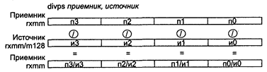 Если преобразованный результат больше, чем максимально возможное целочисленное 32-битное значение, то будет возвращено значение 80000000h. Исключения: NE: #I,#Р; РМ: #АС(0); #GP(0): 37; #NM: 3; #PF(fault-code); #SS(0): 13; #UD: 10-13; #XM; RM: #GP: 13; #NM: 3; #UD: 17-20; #ХМ; VM: исключения реального режима; #АС(0); #PF(fault-code). DIVPS приемник, источник DIVPS (DIVide Packed Single-precision float-point) — деление упакованных значений в формате ХММ согласно следующей схеме.