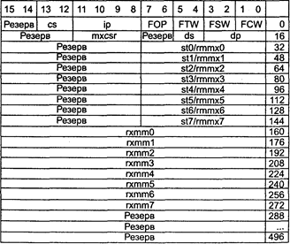 Синтаксис: DIVSS rxmm1,rxmm2/m32 Машинный код: 11110011:00001111:01011110:mod rxmm1 r/m Исключения: 1; NE: #O, #U, #I, #Z, #P, #D; PM: #GP(0): 37; #NM: 3; #PF(fault-code); #SS(0): 13; #UD: 10-13; #XM; RM: #GP: 13; #NM: 3; #UD: 17-20; #XM; VM: исключения реального режима; #АС(0); #PF(fault-code). FXRSTOR источник FXRSTOR (ReSTORe Fp and mmX state and streaming simd extension state) — восстановление без проверки наличия незамаскированных исключений с плавающей точкой состояния сопроцессора, целочисленного и потокового MMX-расширений из 512-байтной области памяти (см. рисунок ниже). Синтаксис: FXRSTOR m512 Машинный код: 00001111:10101110:mod 001 m512