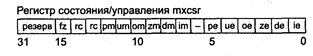 Исключения: 2; PM: #AC: 4; #GP(0): 38; #NM: 3; #SS(0): 13; #UD: 10; RM: #GP: 13; #NM: 3; #UD: 17; VM: исключения реального режима; #АС: 5; #PF(fault-code). FXSAVE приемник FXSAVE (SAVE Fp and mmX state and streaming simd extension state) — сохранение состояния сопроцессора, целочисленного и потокового MMX-расширений в 512-байтной области памяти (см. рисунок в описании команды FXRSTOR). Синтаксис: FXSAVE m512 Машинный код:00001111:10101110:тос1000 m512 Исключения: 2; NE: #I, #Р; PM: #AC(0); #GP(0): 37; #NM: 3; #SS(0): 13; #UD: 10; RM: #GP: 13; #NM: 3; #UD: 17; VM: исключения реального режима; #АС(0); #PF(fault-code). LDMXCSR источник LDMXCSR (LoaD streaming simd extension control/status register MXCSR) — загрузка регистра состояния/управления mxcsr из 32-битной ячейки памяти.