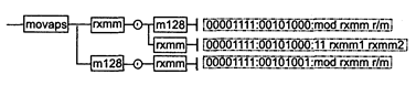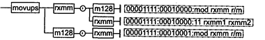 Синтаксис: LDMXCSR m32 Машинный код: 00001111:10101110:mod 010 m32 Замечание: по умолчанию регистр MXCSR загружается значением 1f80h. Исключения: 1; PM: #AC(0); #GP(0): 37; #NM: 3; #PF(fault-code); #SS(0): 13; #UD: 10,12,13; RM: #GP: 13; #NM: 3; #UD: 17,19,20; VM: исключения реального режима; #АС(0); #PF(fault-code). MAXPS приемник, источник MAXPS (return MAXimum Packed Single-precision float-point) – возврат максимального из упакованных значений в формате ХММ. Синтаксис: MAXPS rxmm1, rxmm2/m128 Машинный код: 00001111:01011111 :mod rxmm1 r/m Действие: команда извлекает максимальные значения в каждой из четырех пар вещественных чисел в коротком формате. При этом происходит сравнение значений соответствующих элементов источника и приемника, по результатам которого выполняются действия: • если элемент приемника или элемент источника является сигнализирующим не-числом — sNAN, то в элемент приемника помещается значение источника; • иначе, если элемент источника больше элемента приемника, то в элемент приемника помещается элемент источника. В остальных случаях значения источника и приемника не изменяются. Исключения: 1,3; NE: #I, ftD; PM: #GP(0): 37; #NM: 3; #PF(fault-code); #SS(0): 13; #UD: 10-13; ftXM; RM: #GP: 13; #NM: 3; #UD: 17-20; UXM; VM: исключения реального режима; #PF(fault-code). MAXSS приемник, источник MAXSS (return MAXimum Scalar Single-precision float-point) — скалярный возврат максимального значения в формате ХММ. Синтаксис: MAXSS rxmm1,rxmm2/m32 Машинный код: 11110011:00001111:01011111:mod rxmm1 r/m Действие: команда извлекает максимальное из двух вещественных чисел в коротком формате. При этом происходит сравнение значений младшей пары элементов источника и приемника, по результатам которого выполняются действия, аналогичные рассмотренным в описании команды MAXPS. Старшие три элемента источника и приемника не изменяются. Исключения: 1, 3; NE: #I, #D; PM: #AC(0); #GP(0): 37; #NM: 3; #PF(fault-code); #SS(0): 13; #UD: 10-13; #XM; RM: #GP: 13; #NM: 3; #VD: 17-20; #XM; VM: исключения реального режима; #АС(0); #PF(fault-code). MINPS приемник, источник MINPS (return MINimum Packed Single-precision float-point) — возврат минимального упакованного значения в формате ХММ. Синтаксис: MINPS rxmm1,rxmm2/m128 Машинный код: 00001111:01011101:mod rxmm1 r/m Действие: команда извлекает минимальные значения в каждой из четырех пар вещественных чисел в коротком формате. При этом происходит сравнение значений соответствующих элементов источника и приемника, по результатам которого выполняются действия, аналогичные рассмотренным в описании команды MAXPS. Исключения: 1; NE: #I, #D; PM: #GP(0): 37; #NM: 3; #PF(fault-code); #SS(0): 13; #UD: 10-13; #XM; RM: #GP: 13; #NM: 3; #UD: 17-20; #XM; VM: исключения реального режима; #PF(fault-code). MINSS приемник, источник MINSS (return MINimum Scalar Single-precision float-point) — скалярный возврат минимального значения в формате ХММ. Синтаксис: MINSS rxmm1,rxmm2/m32 Машинный код: 11110011:00001111:01011101:mod rxmm1 r/m Действие: команда извлекает минимальное из двух вещественных чисел в коротком формате. При этом происходит сравнение значений младшей пары элементов источника и приемника, по результатам которого выполняются действия, аналогичные рассмотренным в описании команды MAXPS. Старшие три элемента источника и приемника не изменяются. Исключения: NE: #I, #D; PM: #AC(0); #GP(0): 37; #NM: 3; #PF(fault-code); #SS(0): 13; #UD: 10-13; #XM; RM: #GP: 13; #NM: 3; #UD: 17-20; #ХМ; VM: исключения реального режима; #АС(0); #PF(fault-code). MOVAPS приемник, источник MOVAPS (MOVe Aligned four Packed Single-precision float-point) — перемещение выровненных 128 бит источника в соответствующие биты приемника.