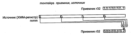 Действие: команда копирует содержимое младшей половины регистра ХММ в 64-битную ячейку памяти или из нее: • если источник — 64-битный операнд в памяти, то его содержимое перемещается в младшую половину приемника, представляющего собой регистр ХММ; • если источник — регистр ХММ, то содержимое его младшей половины перемещается в приемник, который представляет собой 64-битный операнд в памяти. Исключения: РМ: #АС(0); #GP(0): 37; #NM: 3; #PF(fault-code); #SS(0): 13; #UD:10,12,13; RM: #GP: 13; #NM: 3; ttVD: 17,19,20; VM: исключения реального режима; #AC(0); ftPF(fault-code). MOVMSKPS приемник, источник MOVMSKPS (MOVe sign MaSK Packed Single-precision float-point to integer) -перемещение знаковой маски в целочисленный регистр. Синтаксис: MOVMSKPS r32, rxmm Машинный код: 00001111:01010000:11 r32 rxmm Действие: команда формирует маску из знаковых разрядов четырех чисел с плавающей точкой в коротком формате, упакованных в регистр ХММ (источник). После операции содержимое всего 32-битного регистра (приемника) изменяется следующим образом: в его младшую тетраду заносится знаковая маска, остальные разряды регистра обнуляются.