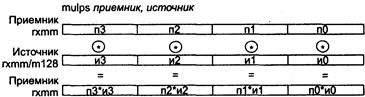 Действие: переместить 128 бит источника в соответствующие биты приемника. Исключения: PM: #АС(0); #GP(0): 37; #NM: 3; #PF(fault-code); #SS(0): 13; #UD: 10; RM: #GP: 13; #NM: 3; #UD: 17; VM: исключения реального режима; #АС(0)-#PF(fault-code). MULPS приемник, источник MULPS (MULtiply Packed Single-precision float-point) — умножение упакованных значений в формате ХММ. Синтаксис: MULPS rxmmi, rxmm2/m128 Машинный код: 00001111:01011001:mod rxmm1 r/m Действие: команда умножает четыре пары вещественных чисел в коротком формате. Схема работы команды MULPS показана на следующем рисунке.