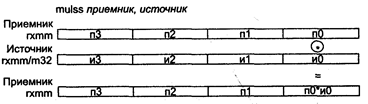Исключения: 1; NE: #O, #U, #I, #P, #D; PM: #GP(0): 37; #NM: 3; #PF(fault-code); #SS(0): 13; #UD: 10, 11; #XM; RM: #GP: 13; #NM: 3; #UD: 17, 18; #XM; VM: исключения реального режима; #PF(fault-code). MULSS приемник, источник MULSS (MULtiply Scalar Single-precision float-point) — умножение скалярных значений в формате ХММ. Синтаксис: MULSS rxmm1,rxmm2/m32 Машинный код: 11110011:00001111:01011001:mod rxmm1 r/m Действие: команда умножает вещественные значения в младших парах операндов в формате ХММ. Операнды источник и приемник находятся в регистре ХММ, кроме того, операнд источник может находиться в 32-битной ячейке памяти. Схема работы команды MULSS показана на следующем рисунке.