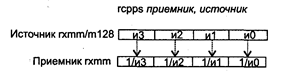 величину полученного значения корня по формуле: Исключения: РМ: #АС(0); #GP(0): 37; #NM: 3; #PF(fault-code); #SS(0): 13; #UD: 10; RM: #GP: 13; #NM: 3; #UD: 17; VM: исключения реального режима; #АС: 5; #PF(fault-code). SHUFPS приемник, источник, маска SHUFPS (Shuffle Packed Single-precision float-point) — перераспределение упакованных значений в формате ХММ. Синтаксис: SHUFPS rxmm1, rxmm2/m128,i8 Машинный код: 00001111:11000110:mod rxmm1 r/m: i8 Действие: команда перераспределяет любые два из четырех двойных слов приемника в два младших двойных слова того же приемника и любые два из четырех двойных слов источника в два старших двойных слова приемника. Если использовать один и тот же регистр ХММ в качестве источника и приемника, то можно выполнять любые перестановки в пределах одного регистра. Каждая пара бит маски определяет номер двойного слова источника или приемника, которое будет перемещено в приемник следующим образом: • маска[1:0] • 00 приемник[00...31] ß источник[00...31] • 01 приемник[00...31] ß источник[32...63] • 10 приемник[00...31] ß источник[64...95] • 11 приемник[00...31] ß источник[96..127] • маска[3:2] • 00 приемник[32...63] ß источник[00...31] • 01 приемник[32...63] ß источник[32...63] • 10 приемник[32...63] ß источник[64...95] • 11 приемник[32...63] ß источник[96...127] • маска[5:4] • 00 приемник[64...95] ß источник[00...31] • 01 приемник[64...95] ß источник[32...63] • 10 приемник[64...95] ß источник[64...95] • 11 приемник[64...95] ß источник[96...127] • маска[7:6] • 00 приемник[96...127] ß источник[00...31] • 01 приемник[96...127] ß источник[32...63] • 10 приемник[96...127] ß источник[64...95] • 11 приемник[96...127] ß источник[96...127] Схематически работа команды SHUFPS показана на следующем рисунке.