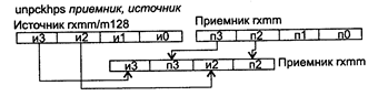 Исключения: NE: #I, #D; PM: #AC(0); #GP(0): 37; #NM: 3; #PF(fault-code); #SS(0): 13; #UD: 10-13; #XM; RM: #GP: 13; #NM: 3; #UD: 17-20; #XM; VM: исключения реального режима; #АС(0); #PF(fault-code). UNPCKHPS приемник, источник UNPCKHPS (Unpack High Packed Single-precision float-point data) — чередование верхних упакованных значений в формате ХММ. Синтаксис: UNPCKHPS rxmm1, rxmm2/m128 Машинный код: 00001111:00010101:mod rxmm1 r/m Действие: перемещение путем чередования двух старших двойных слова приемника и источника. Младшие двойные слова приемника и источника игнорируются. Схема выполнения команды UNPCKHPS показана на следующем рисунке.