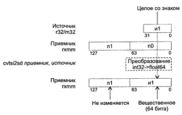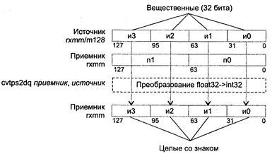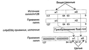 (приемник и (или) источник — NAN или в неопределенном формате), 4 (приемник Исключения: SIMD (NE): #I (если операнд SNaN или QNaN), #D; PM: #GP(0): 37, 42; #NM: 3; #PF(fault-code); #SS(0): 13; #UD: 10-12, 15; #XM; RM: #GP: 13, 16; #NM: 3; #UD: 17, 19, 22; #XM; VM: исключения реального режима; #PF(fault-code). CMPSD приемник, источник, условие CMPSD (CoMPare Scalar Double-precision floating-point values description) — сравнение скалярных значений с плавающей точкой двойной точности. Синтаксис: CMPSD xmm1, xmm2/m64, imm8 Машинный код: F2 0F C2 /r i8 Действие: сравнить упакованные значения с плавающей точкой двойной точности в разрядах [63-0] приемника и источника. Формирование проверяемого условия и результата выполнения команды аналогичны соответствующим атрибутам команды CMPPD. Исключения: SIMD (NE): #I (если операнд SNaN или QNaN), #D; PM: #GP(0): 37; #SS(0): 13; #PF(fault-code); #NM: 3; #XM; #UD: 10-12, 15; #AC(0)_cpl3; RM: #GP: 13, 16; #NM: 3; #XM; #UD: 17-19, 22; VM: исключения реального режима; #PF(fault-code); #AC(0)_u. COMISD приемник, источник, условие COMISD (COMpare Scalar ordered Double-precision floating-point values and set EFLAGS) — сравнение упорядоченных скалярных значений с плавающей точкой двойной точности и установка регистра EFLAGS. Синтаксис: COMISD xmm1, xmm2/m64 Машинный код: 66 0F 2F /r Действие: сравнить упорядоченные скалярные значения с плавающей точкой двойной точности в разрядах [63-0] приемника и источника. По результату сравнения установить флаги ZF, PF и CF в регистре EFLAGS: приемник > источник (ZF = О, PF = О, CF = 0), приемник > источник (ZF = О, PF = О, CF = 1), приемник = источник (ZF = 1, PF = О, CF = 0), приемник и(или) источник NAN или в неопределенном формате (ZF = 1, PF = 1, CF = 1). Флаги 0F, SF и AF устанавливаются в 0. В случае генерации немаскированного исключения с плавающей точкой регистр EFLAGS не модифицируется. Исключения: SIMD (NE): #I (если операнд SNaN или QNaN), #D; PM: #GP(0): 37; #SS(0): 13; #PF(fault-code); #NM: 3; #XM; #UD: 10-12, 15; #AC(0)_cpl3; RM: #GP: 13; #NM: 3; #XM; #UD: 17-19, 22; VM: исключения реального режима; #PF(fault-code); #AC(0)_u. CVTDQ2PD приемник, источник CVTDQ2PD (ConVerT packed Doubleword Integers to Packed Double-precision floating-point values) — преобразование двух упакованных 32-битных целых в два упакованных значения с плавающей точкой двойной точности. Синтаксис: CVTDQ2PD rxmm1, rxmm2/m64 Машинный код: F3 0F E6 Действие: алгоритм работы команды показан на рисунке ниже.