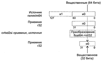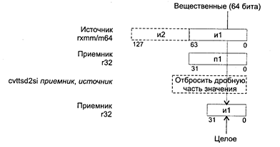 Исключения: РМ: #GP(0): 37; #SS(0): 13; #PF(fault-code); #NM: 3; #XM; #UD: 10-12,15; #AC(0)_cpl3; RM: #GP: 13; #NM: 3; #XM; #UD: 17-19,22; VM: исключения реального режима; #PF(fault-code); #AC(0)_u. CVTSD2SI приемник, источник CVTSD2SI (ConVerT Scalar Double-precision floating-point value to Doubleword Integer) — преобразование скалярного значения с плавающей точкой двойной точности в 32-битное целое. Синтаксис: CVTSD2SI r32, rxmm/m64 Машинный код: F2 0F 2D /r Действие: алгоритм работы команды показан па рисунке ниже.