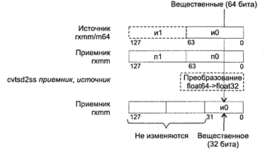 Действие: команда копирует младшие 32 бита источника в младшие 32 бита приемника. Если используется операнд в памяти, то в команде указывается адрес, соответствующий адресу младшего байта данных в памяти. Если в качестве источника используется операнд в памяти, то эти 32 бита копируются в младшее двойное слово 128-битного приемника — регистра ХММ, остальные 96 бит этого регистра устанавливаются в 0.