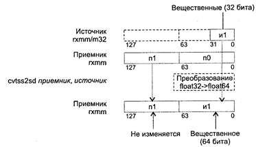 Исключения: РМ: #GP(0): 37; #NM: 3; #PF(fault-code); #SS(0): 13; #UD: 10-12, 15; #XM; #AC(0)_cpl3; RM: #GP: 13; #NM: 3; #UD: 17-19, 22; #XM; VM: исключения реального режима; #AC(0)_u; #PF(fault-code). CVTSS2SD приемник, источник CVTSS2SD (ConVerT Scalar Single-Precision floating-point value to Scalar Double-precision floating-point value) — преобразование скалярного значения с плавающей точкой одинарной точности в скалярное значение с плавающей точкой двойной точности. Синтаксис: CVTSS2SD rxmm1, rxmm2/m32 Машинный код: F3 0F 5A /r Действие: алгоритм работы команды показан на рисунке ниже.