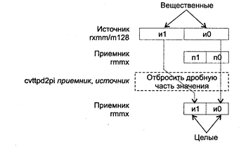 Исключения: РМ: #GP(0): 37; ftNM: 3; #PF(fault-code); #SS(0): 13; #UD: 10-12, 15; #ХМ; #АС(0)_ср13; RM: #GP: 13; #NM: 3; #UD: 17-19, 22; #XM; VM: исключения реального режима; #AC(0)_u; #PF(fault-code). CVTTPD2PI приемник, источник CVTTPD2PI (ConVerT with Truncation Packed Double-precision floating-point values to Packed doubleword Integers) — преобразование (путем отбрасывания дробной части) двух упакованных значений с плавающей точкой двойной точности в два упакованных 32-битных целых значения. Синтаксис: CVTTPD2PI rmmx, rxmm/m128 Машинный код: 66 0F 2C /r Действие: алгоритм работы команды показан на рисунке ниже.