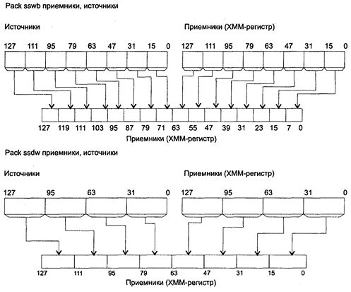 приемника по схеме: приемник[63-0]ßприемник[63-0] Исключения: SIMD (NE): #O, #U, #I, #Р, #D; PM: #GP(0): 37; #SS(0): 13; #NM: 3; #PF(fault-code); #UD: 10-12, 15; #XM; #AC(0)_cpl3; RM: #GP: 13; #NM: 3; #UD: 17-19, 22; #ХМ; VM: исключения реального режима; #PF(fault-code); #AC(0)_u. ORPD приемник, источник ORPD (bitwise logical OR 0F Double-precision floating-point values) — поразрядное логическое ИЛИ над упакованными значениями с плавающей точкой двойной точности. Синтаксис: ORPD xmm1, xmm2/m128 Машинный код: 66 0F 56 /r Действие: выполнить операцию поразрядного логического ИЛИ над парами упакованных значений с плавающей точкой двойной точности в приемнике и источнике по схеме: приемник[127-0]ßприемник[127-0]) побитное_ОR источник[127-0]. Исключения: PM: #GP(0): 37,42; #NM: 3; #PF(fault-code); #SS(0): 13; #UD: 10-12, 15; #XM; RM: #GP: 13,16; #NM: 3; #UD: 17-19,22; #XM; VM: исключения реального режима; #PF(fault-code). PACKSSWB/PACKSSDW приемник, источник PACKSSWB (Pack with Signed Saturation Words to Bytes) — упаковка со знаковым насыщением слов в байты. PACKSSDW (Pack with Signed Saturation Double Words to Words) — упаковка со знаковым насыщением двойных слов в слова. Синтаксис и машинный код: 66 0F 63 /r PACKSSWB rxmm1, rxmm2/m128 66 0F 6В /r PACKSSDW rxmm1, rxmm2/m128 Действие: команды преобразуют шестнадцать/восемь элементов размером в слово/двойное слово из источника и приемника в шестнадцать/восемь элементов в операнде приемник размером в байт/слово (см. рисунок ниже). Если значение элемента источника превышает допустимое значения элемента приемника, то в элементе приемника формируется предельный результат в соответствии с принципом знакового насыщения: • PACKSSWB — 07fh для положительных чисел и 080h для отрицательных; • PACKSSDW — 07fffh для положительных чисел и 08000h для отрицательных. Флаги: не изменяются.