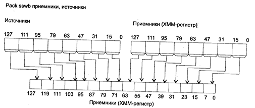 Исключения: РМ: #GP(0): 2, 42; #SS(0): 1; #UD: 10, 12, 15; #NM: 3; #PF(fault-code); RM: #GP: 13,16; #UD: 17,19,22; #NM: 3; VM: исключения реального режима; #PF(fault-code). PACKUSWB приемник, источник PACKUSWB (PACK with Unsigned Saturation Description) — упаковка с беззнаковым насыщением слов в байты. Синтаксис: PACKUSWB rxmm1, rxmm2/m128 Машинный код: 66 0F 67 /r Действие: команда преобразует шестнадцать элементов из источника и приемника размером в слово в шестнадцать элементов в приемнике размером в байт (см. рисунок ниже). Если пересылаемое значение больше допустимого для поля приемника, то в нем формируется предельный результат в соответствии с принципом беззнакового насыщения, что соответствует значениям 0Ffh для положительных чисел и 00h для отрицательных.