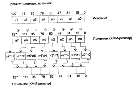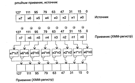 Исключения: РМ: #GP(0): 2, 42; #SS(0): 1; #UD: 10, 12, 15; #NM: 3; #PF(fault-code); RM: #GP: 13,16; #UD: 17,19,22; #NM: 3; VM: исключения реального режима; #PF(fault-code). PMULHW приемник, источник PMULHW (MULtiply Packed signed integers and store High result) — упакованное знаковое умножение слов с возвратом старшего слова результата. Синтаксис: PMULHW rxmm1, rxmm2/m128 Машинный код: 66 0F E5 /r Действие: команда производит умножение упакованных слов источника и приемника с учетом знака и формирует элементы результата в соответствии со схемой, приведенной при описании команды PMULHUW. Флаги: не изменяются. Исключения: РМ: #GP(0): 2, 42; #SS(0): 1; #UD: 10, 12, 15; #NM: 3; #PF(fault-code); RM: #GP: 13,16; #UD: 17,19,22; #NM: 3; VM: исключения реального режима; #PF(fault-code). PMULLW приемник, источник PMULLW (MULtiply Packed signed integers and store Low result) — упакованное знаковое умножение слов с возвратом младшего слова результата. Синтаксис: PMULLW xmm 1, xmm2/m 128 Машинный код: 66 0F D5 /r Действие: команда производит умножение с учетом знака упакованных слов источника и приемника и формирует элементы результата в соответствии с приведенной ниже схемой. Как видно из этой схемы, в результате умножения слов источника и приемника получаются промежуточные результаты размером 32 бита. Далее младшее слово (16 бит) из каждого 32-битного элемента промежуточного результата умножения исходных элементов помещается в 16-битный элемент результата (операнд приемник). Флаги: не изменяются.