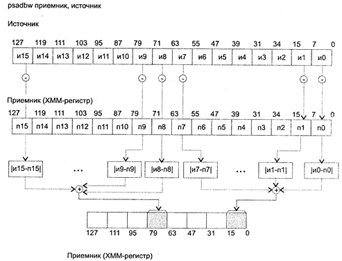 ХММ-регистр или ячейка памяти: приемник[63-0}ßприемник[31-0] Когда результат умножения слишком большой, чтобы быть представленным в приемник, то он "заворачивается" (перенос игнорируется). Флаги: не изменяются. Исключения: РМ: #GP(0): 2,42; #SS(0): 1; #UD: 10,12,15; #NM: 3; #PF(fault-code); RM: #GP: 13, 16; #UD: 17, 19, 22; #NM: 3; VM: исключения реального режима; #PF(fault-code). POR приемник, источник POR (bitwise logical OR) — упакованное логическое ИЛИ. Синтаксис: POR rxmm1, rxmm2/m128 Машинный код: 66 0F ЕВ /r Действие: команда производит побитовую операцию логическое ИЛИ над всеми битами операндов источника и приемника. Результат помешается в операнд приемник. Флаги: не изменяются. Исключения: РМ: #GP(0): 2, 42; #SS(0): 1; #UD: 10, 12, 15; #NM: 3; #PF(fault-code); RM: #GP: 13,16; #UD: 17,19, 22; #NM: 3; VM: исключения реального режима; #PF(fault-code). PSADBW приемник, источник PSADBW (Compute Sum 0F Absolute Differences) — суммарная разница значений нар беззнаковых упакованных байт. Синтаксис: PSADBW rxmm1, rxmm2/m128 Машинный код: 66 0F F6 /r Действие: для каждой пары байт двух упакованных учетверенных слов операндов источник и приемник вычислить модуль разности, после чего сложить полученные модули. Результат записать в младшее слово каждого из двух упакованных учетверенных слов приемника, старшие три слова в упакованных учетверенных словах приемника обнулить. Принцип работы программы поясняет схема ниже. Флаги: не изменяются.