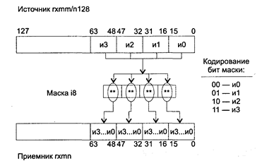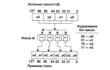Исключения: РМ: #GP(0): 2, 42; #SS(0): 1; #UD: 10, 12, 15; #NM: 3; #PF(fault-code); RM: #GP: 13,16; #UD: 17,19,22; #NM: 3; VM: исключения реального режима; #PF(fault-code). PSHUFD приемник, источник, маска PSHUFD (SHUFfle Packed Doublewords) — копирование двойных слов из ХММ-операнда источник в ХММ-операнд приемник. Синтаксис: PSHUFD xmm1, xmm2/m128, imm8 Машинный код: 66 0F 70 /r i8 Действие: на основе значения пар бит маски копировать двойные слова из источника в приемник. Каждая пара бит маски определяет номер слова источника для перемещения.в приемник следующим образом: • маска[1:0]: • 00 приемник[0...31] ß источник[0...31], • 01 приемник[0...31] ß источник[32...63], • 10 npueMHUK[0...31] ß источник[64...95]; • 11 приемник[0...31] ß источник[96..127]; • маска[3:2]: • 00 приемник[32...63] ß источник[0...31]; • 01 приемник[32...63] ß источник[32...63]; • 10 приемник[32...63] ß источник[64...95]; • 11 приемник[32...63] ß источник[96..127]; • маска[5:4]: • 00 приемник[64...95] ß источник[0...31]; • 01 приемник[64...95] ß источник[32...63], • 10 приемиик[64...95] ß источник[64...95]; • 11 приемник[64...95] ß источник[96..127]; • маска[7:6]: • 00 приемник[96..127] ß источник[0...31]; • 01 приемник[96..127] ß источник[32...63]; • 10 приемник[96..127] ß источник[64...95]; • 11 приемник[96..127] ß источник[96...127]. Если использовать один и тот же ХММ-регистр в качестве источника и приемника, то можно выполнять любые перестановки двойных слов в пределах одного ХММ-регистра, в том числе и инициализацию значением одного двойного слова других двойных слов. Работу команды PSHUFD поясняет следующая схема: