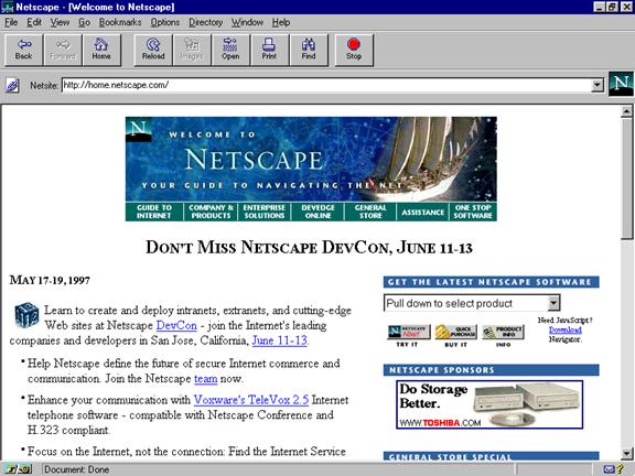2.1. Netscape Navigator for Windows 95Сейчас мультимедия из сферы научных дискуссий превратилась в реальность. Она доступна каждому, имеющему компьютер, модем и броузер World Wide Web (или просто Web), например Netscape Navigator. Имея эти инструменты можно путешествовать по всему миру, получая доступ к документам, аудио- и видеоклипам, графике, торговым сведениям, шуткам и другой информации, хранящейся в подключенных к Internet компьютерах - Web серверах, разбросанных по всему миру и действующих как одно целое. Что такое World Wide Web? Это попытка представить всю информацию, доступную в сети Internet в виде совокупности гипертекстовых документов, позволяющих двигаться от документа к документу через ссылки. Ссылка или пиктограмма - это выделенное слово или словосочетание позволяющее раскрыть его смысл. Ссылками также могут являться графические картинки. Таким образом Web напоминает электронную мультимедийную инциклопедию. Вот как выглядит домашняя страница Web фирмы Netscape Navigator.