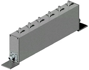 Рис. 3. Внешний вид перестраиваемого узкополосного высокочастотного фильтра-грозоразрядника на периодических структурах Если же в фильтре имеется возможность выполнять внешнюю настройку каждого резонатора, количество которых может быть 6...10 и больше (рис.3), то качественная и долговечная герметизация требует более тщательного подхода к этому процессу ввиду значительного количества точек герметизации. Зато в этом случае после изготовления фильтра есть возможность получения необходимых оптимальных параметров (минимальные прямые потери, требуемая ширина полосы пропускания, максимальное внеполосное подавление) путем его тщательной окончательной настройки. Такие фильтры, при отсутствии герметизации, необходимо устанавливать в помещение, хотя, как правило, это не является недостатком. Более того, в случае самостоятельного применения фильтра (без использования усилителя) его внутренняя установка является обязательным требованием. Не следует забывать о том, что конструкция высокочастотных фильтров, работающих в диапазоне 2,45ГГц, позволяет им дополнительно выполнять функцию грозозащиты. А устройства грозозащиты, как известно, рекомендуется устанавливать и заземлять уже на спуске коаксиального кабеля в помещении возле имеющихся линий заземления радиооборудования. Схема подключения фильтра-грозоразрядника при его внутренней установке показана на рис.4а. В этом случае оборудование будет защищено не только от остаточных импульсов разряда в антенне, но и от статических наводок в самом кабеле снижения. Наконец, при внутренней установке фильтров значительно увеличивается срок их службы, и производитель может позволить себе расширить гарантийные обязательства. При внешнем же использовании даже герметичных фильтров сложно гарантировать их длительную эксплуатацию.