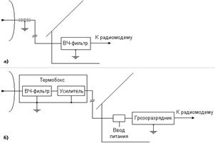 Рис. 4. Схемы установки высокочастотного фильтра: а) без усилителя; б) с усилителем При необходимости совместного использования ВЧ-фильтра с усилителем следует либо приобретать фильтр в герметичном исполнении, либо размещать его вместе с усилителем в герметичном термобоксе с последующей установкой и заземлением бокса на мачте в непосредственной близости к антенне, как показано на рис.4б. В этом случае для обеспечения надежной защиты оборудования от грозовых разрядов рекомендуется устанавливать дополнительное грозозащитное устройство в помещении возле радиооборудования и имеющихся линий контура заземления. Внешний вид такого устройства показан на рис.5.